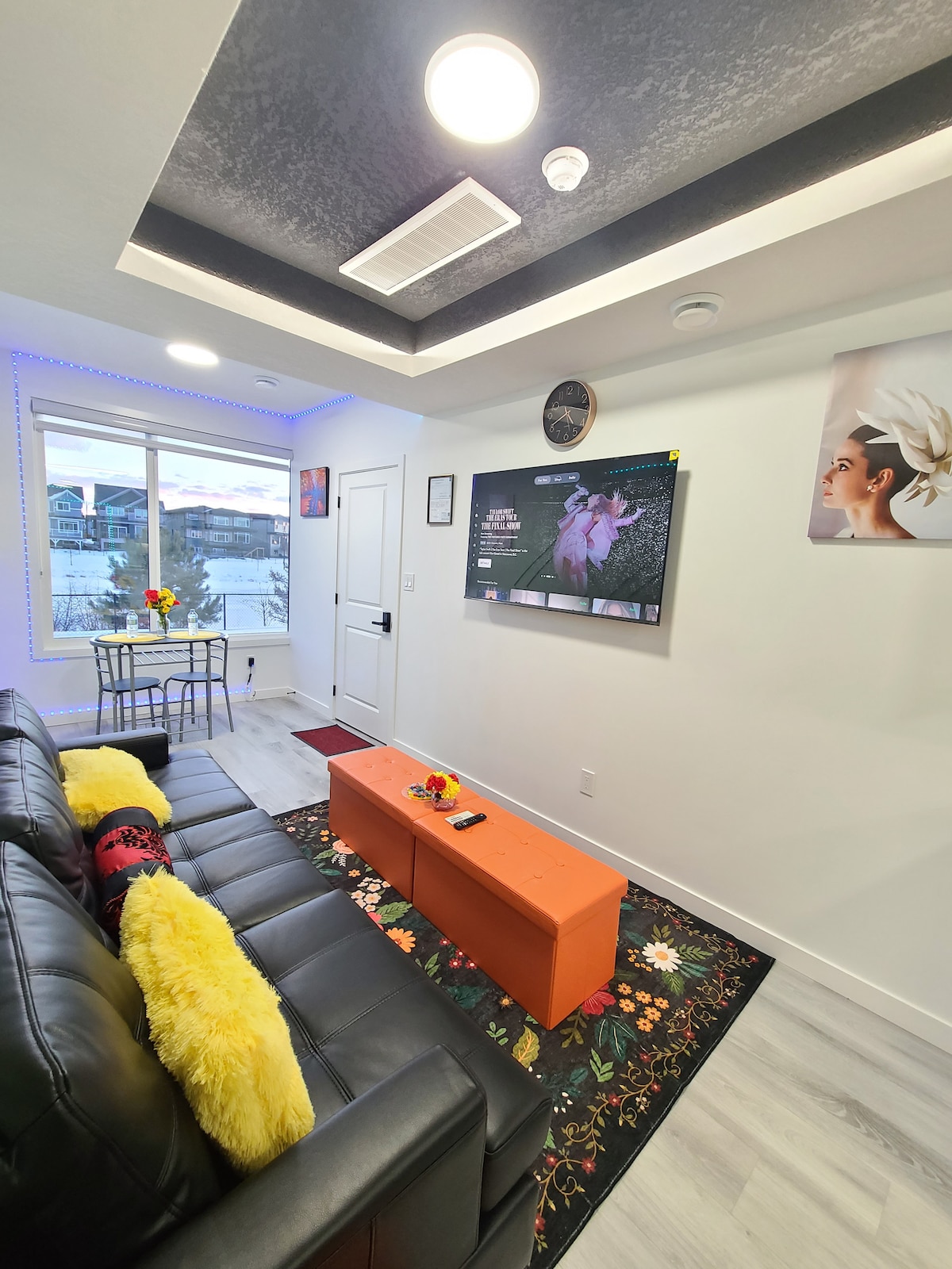 🏡 Key Features ✔️ Bright, spotless legal basement suite ✔️ 2 bedrooms with queen beds & hotel-style linens ✔️ Japanese-style futon for 5th guest only – extra use by request ✔️ Kitchen with milk Keurig coffee maker ✔️ Cozy living room with 58" Smart TV ✔️Stylish indoor hanging chair ✔️ Private entrance & easy self check-in ✔️ Free street parking or driveway spot 📍 Nearby ✔️ 2-min drive to shopping center ✔️ 15-min drive to Rabbit Hill Ski Resort ✔️ 20-min drive to YEG ✔️ 20-min drive to WEM