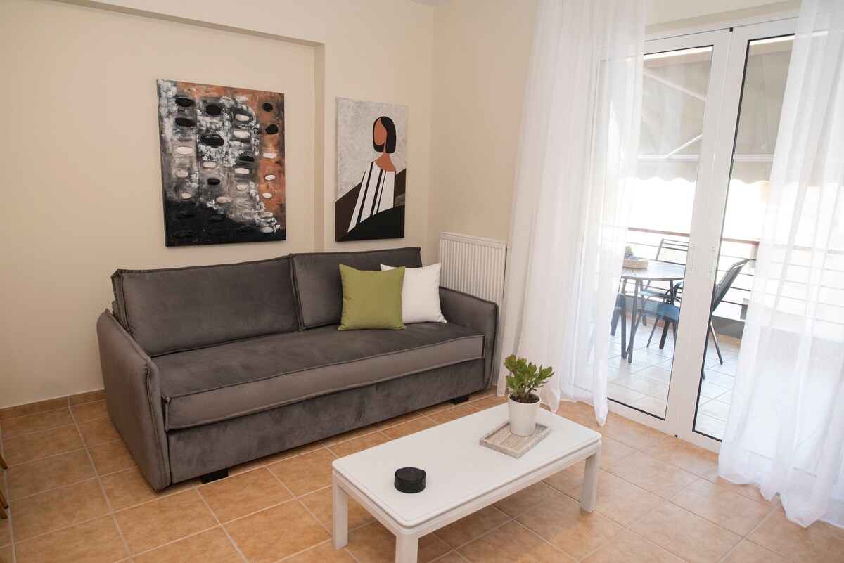 The apartment is located in a central part of the city, with all kinds of shops around but mostly very close to organized beaches with beach bars and tavernas. The nearest is "Kourendi" (at a distance of 150 m.) Τhe Bus station is located 30 m. away from the building! Come....and you will enjoy a wonderful experience of staying in a safe, clean, bright and positive place!