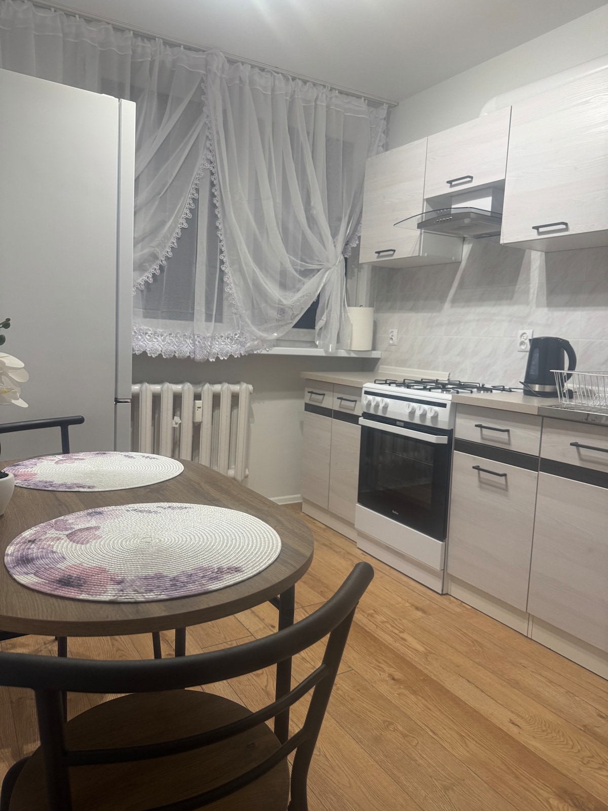Spacious apartment (53 m2) with two bedrooms located 2 km from the city center. The kitchen is equipped with a fridge, dishwasher, oven, induction hob, hood, electric kettle, coffee maker and kitchen utensils (pots, cutlery, etc.) The apartment also has: a washing machine, a clothes dryer, a hair dryer, an iron, an ironing board. Allergy-friendly apartment. Wroclaw Airport can be reached in less than an hour, and the LSSE and the A4 road in 5 minutes.