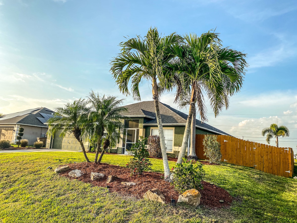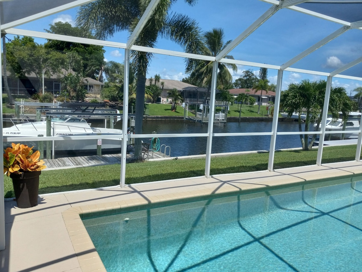 Spacious and gorgeous 4 bedrooms & 2 bath Vacation house with 1 King, 3 Queens, 2 Fulls, 1 Twin, 1 sofa queen bed. it fits up to 12 people easily. Dreamed coastal-themed home. Prestigious private Heated pool, and canal access (park your own small boat or Jetski). Go fishing at the Caloosahatchee River (Just an 8-minute boat drive from the home).