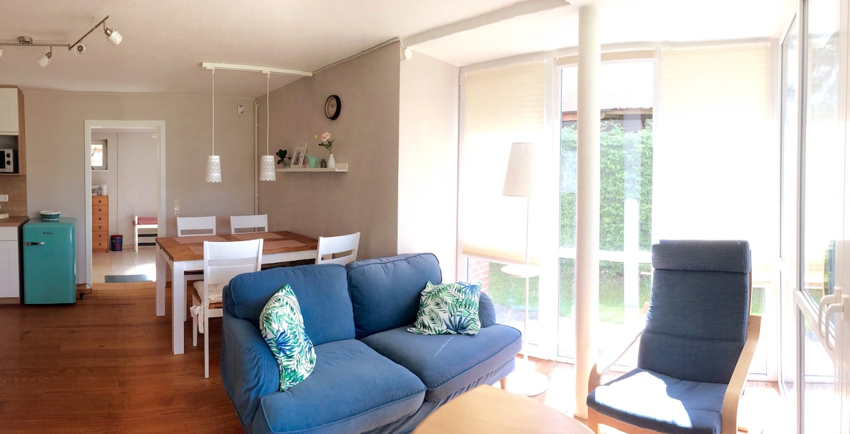 Hello! We offer our apartment as private accommodation for rent. It has its own entrance, kitchen, shower room and living / bedroom. It is connected to our house via an internal staircase. Upstairs, however, there is a door which is locked. The place has a separate entrance. We allow you a flexible key handover. Towels, bed linen, Wi-Fi, kettle, dishwasher, fireplace and terrace are available. Free parking on the premises.