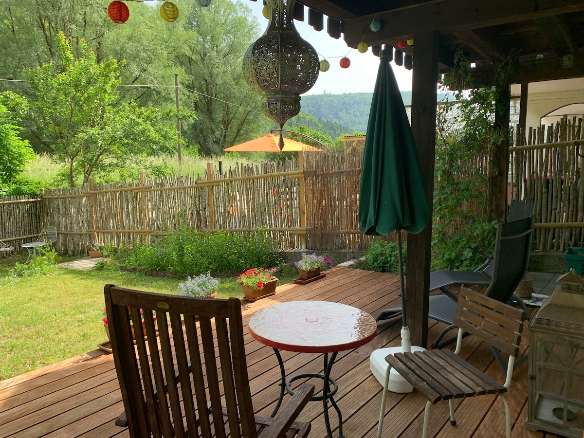 Vacation in the middle of nature, mountains, forests and valleys of the Swabian Alps. Our apartment is located on the edge of a small idyllic village of 450 inhabitants (near the city of Balingen) with a corner shop, playground and outdoor swimming pool. On the garden level of a detached house, bright and friendly rooms, a covered terrace with garden area and a fantastic view over the whole valley await you. From your sunbathing area, you can relax and enjoy the view and the tranquility.