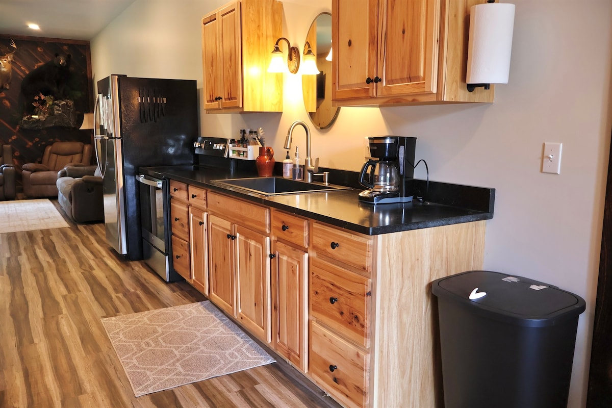 ON ATV and SNOWMOBILE TRAILS!! Separate porch, steps, entrance and porch furniture. fire pit, picnic table, charcoal grill area for each cabin. Enter from your private entrance door and up 13 steps to a luxury cabin Room for 2 -24' trailers. 1.5 baths, 1 bedroom with 1 queen and 2 twin Amish twig beds, full bath. Powder room off great room area. Quiet area. PLEASE NOTE Winter may need 4WD. Air mattresses available for over 4 guests PLEASE NOTE:3BR" Bear's Den" separate listing.