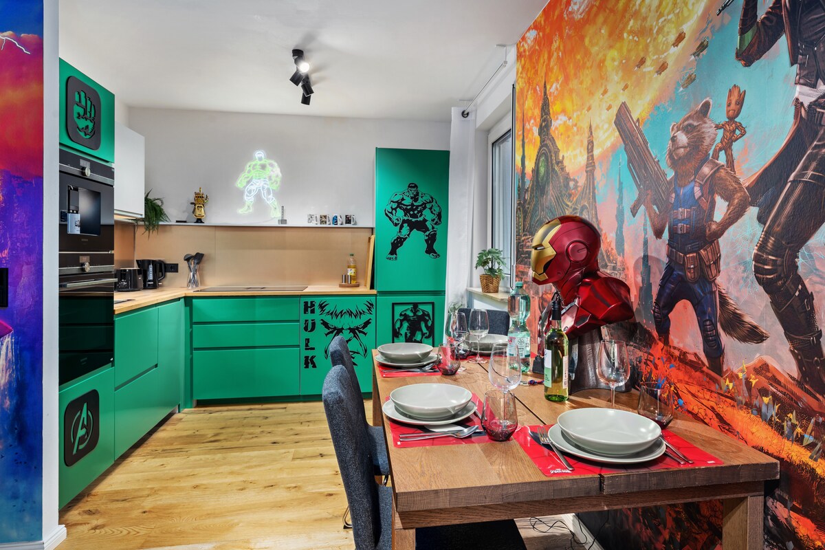Große Wohnung auf 2 Ebenen mit Heimkino für Familien und Gruppen. Ideal gelegen in Leipzig’s Südvorstadt. Zahlreiche Restaurants, Bars und Ausgehmöglichkeiten befinden sich um die Ecke auf der Karli (Leipzig’s Kneipenmeile). Die Altstadt ist nur eine kurze Straßenbahnfahrt/Busfahrt entfernt. Mit Hotelbettwäsche und professioneller Reinigung bieten wir ein Fünf-Sterne-Erlebnis. Es gibt eine voll ausgestattete Wohnküche mit allem, was man zum Kochen und Essen mit bis zu 8 Personen benötigt.