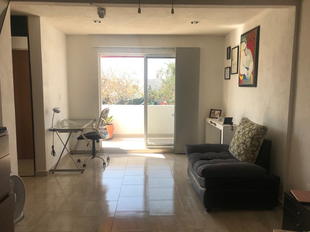 “Teté's house” Take it easy at this unique and tranquil getaway. Spacious, fully-equipped suite with separate entrance and access code. Full kitchen and bathroom with luxury finishes. SmartTV room, private dining room and exercise equipment overlooking the beautiful garden. Located in the northern part of the city, 10 minutes from Plaza Mayor. A private development with restaurants, parks and internal services (pharmacy, gym, OXXO…). Free covered parking. Amenities included.
