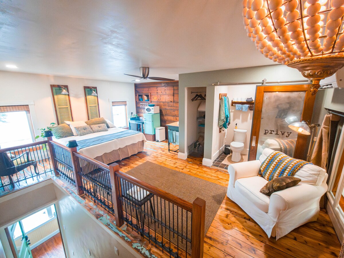 Ever wanted to see what goes on in a commercial bakery? Imagine waking to the aroma of baking bread and cinnamon rolls? Get a bird's eye view into the kitchen of the Village Hive Bakery Kitchen while staying in the newly renovated "flatlet". Salvaged & repurposed building supplies used to create a unique studio apartment above the bakery retail. Guests can enjoy the retail farmhouse table and comfortable seating space by the Main Street picture window. Cooking/baking classes available.