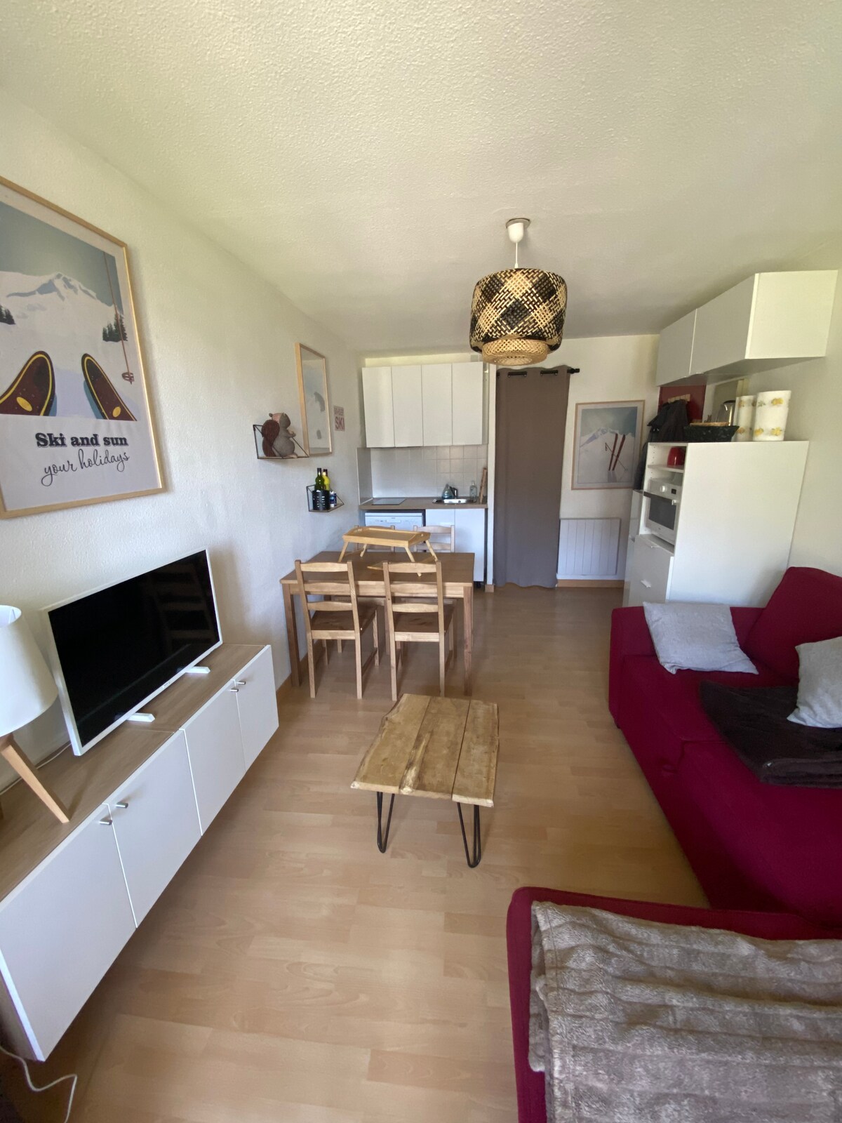 T2 cabin of 30 m2 including a bedroom, a shower room, a hallway with 2 bunk beds and a living room with sofa bed, equipped kitchen and connected TV. The apartment is located about 200 m from the slopes. The shuttle stop, a Spar supermarket, and a butcher shop are at the foot of the residence. It also has a ski locker. Parking is available in front of the residence. Linens and towels are not provided, only blankets and tea towels.