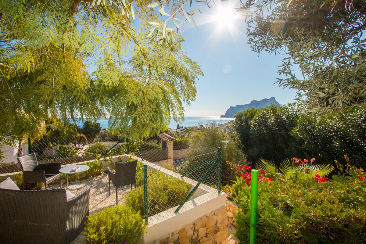 Our enchanting villa, with its incredible garden, swiming pool and barbecue, is at 15 mns walk from beaches and a watersports club, Les Basetes, where you will be able to realize nautical activities such as windsurf, catamaran, diving, etc. The marvelous sea view, and to the Peñon de Ifach, from the house, will make your holidays just unforgivable!!