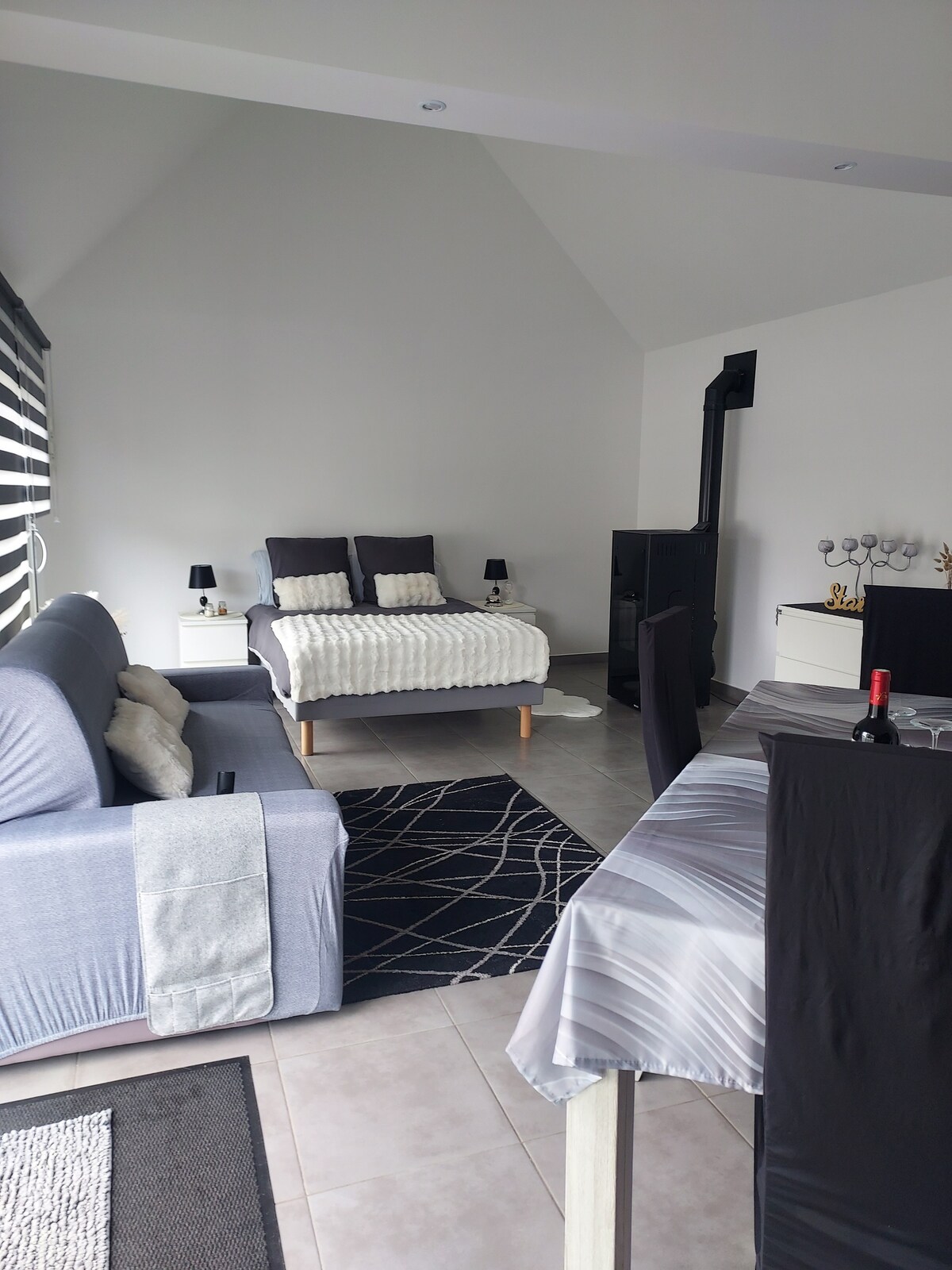 Relax in this quiet and stylish accommodation. Furnished and fully equipped house that includes a living room with: a seating area with TV, and a pellet stove, a dining area with fully equipped kitchen, oven, microwave, fridge, filter coffee maker, kettle and washing machine, a bathroom with shower, sink and toilet, and a sleeping area with a double bed. You will enjoy a pleasant and well-maintained exterior with garden furniture and barbecue. No pets allowed.