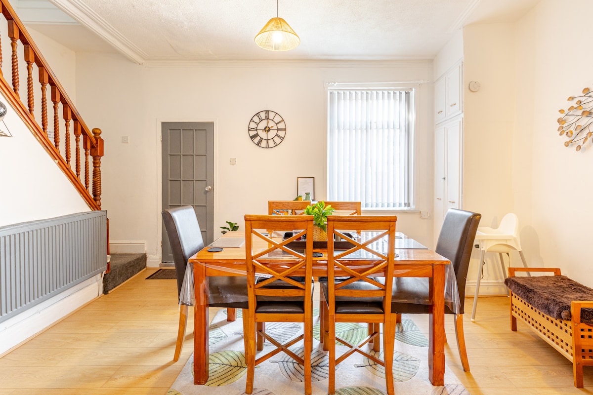 Our lovely three story three bedroom house offers large group of guests in the heart of Manchester! All shops, (Asda) and amenities on walking distance , an array of restaurants offering diverse cuisines, including the city's renowned Indian restaurants. Convenient access to all public transport links for numerous routes directly connecting you to Manchester City Centre and Stockport Town Centre. Peak District is just 11 miles, Etihad Stadium and Manchester United is 4.5 miles.