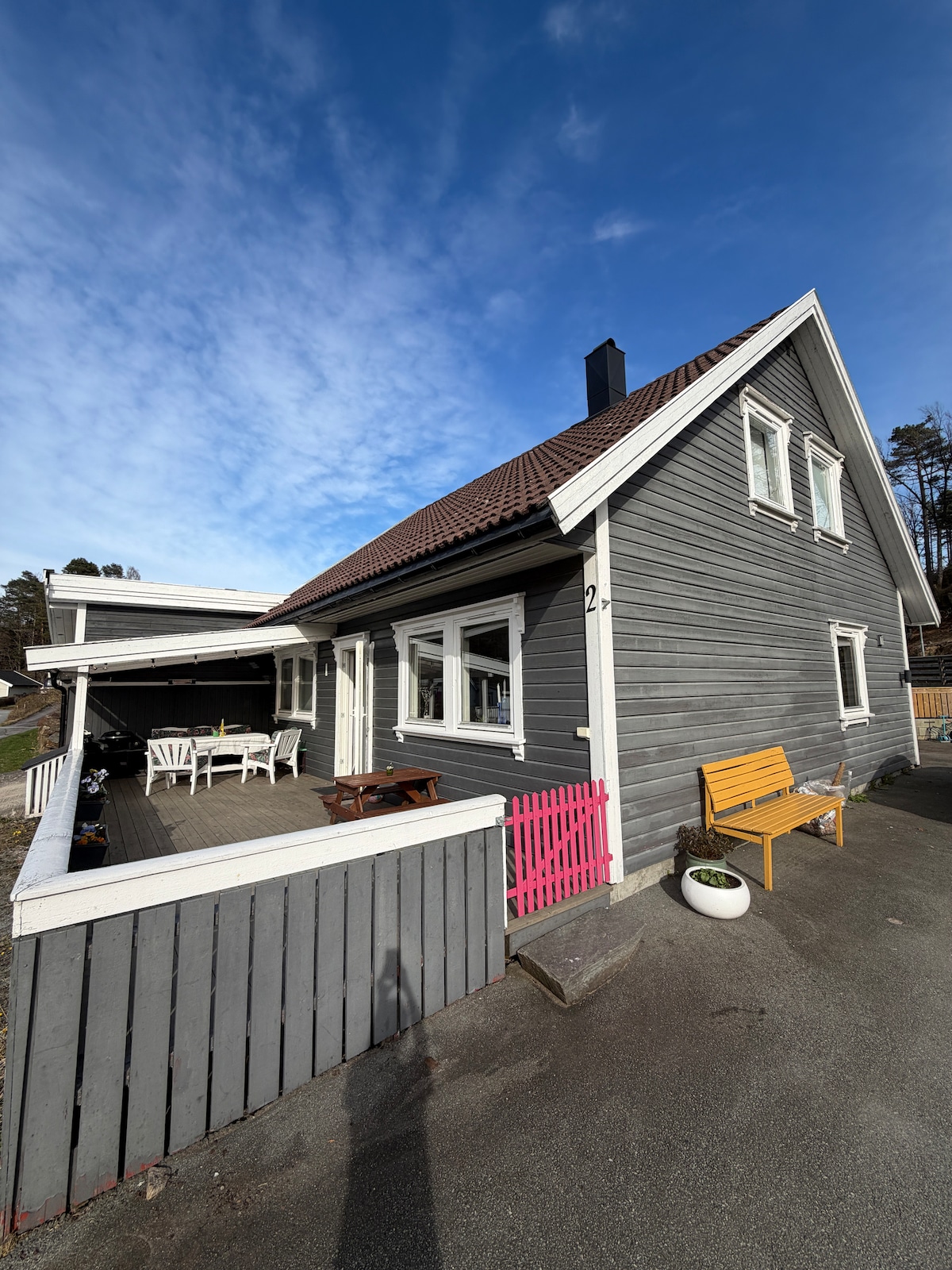 The house is located close to the sea and it is only a five minute walk to the finest beaches in Grimstad. Walking distance to the city center. (1.7 km). The university is located behind the house. The area is quiet most of the year, but it is full of life and holiday guests here in the summer. 135 sqm, with lawn and plants outside. Little traffic and the pedestrian street goes from the house to the beaches and the city center. Safe for children.