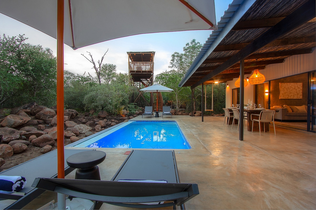 Birdsong is a private, self-catered, and solar-powered house in a wildlife conservancy adjoining Kruger National Park. Relax on the downstairs outdoor lounge with heated pool as zebra, kudu, and many others stop by to visit. Watch the sun set from the hammock on the upper patio. Exercise in the gym space. And if you just can't get away from work, there is a large table upstairs with a beautiful video background! Birdsong is just 15 minutes from Kruger's Crocodile Bridge gate.