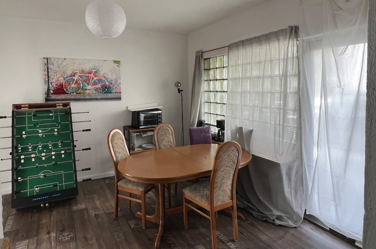 This stylish accommodation is perfect for private individuals as well as for trade fair trips. Adults and children enjoy a piece of real nature between two big cities. Everyone can end the evening after a round of sports (sports hall, basketball court and play barn with trampoline and zipline/slide) around the campfire overlooking the lake. The outdoor pool is located in the large communal garden and is used by all of us.