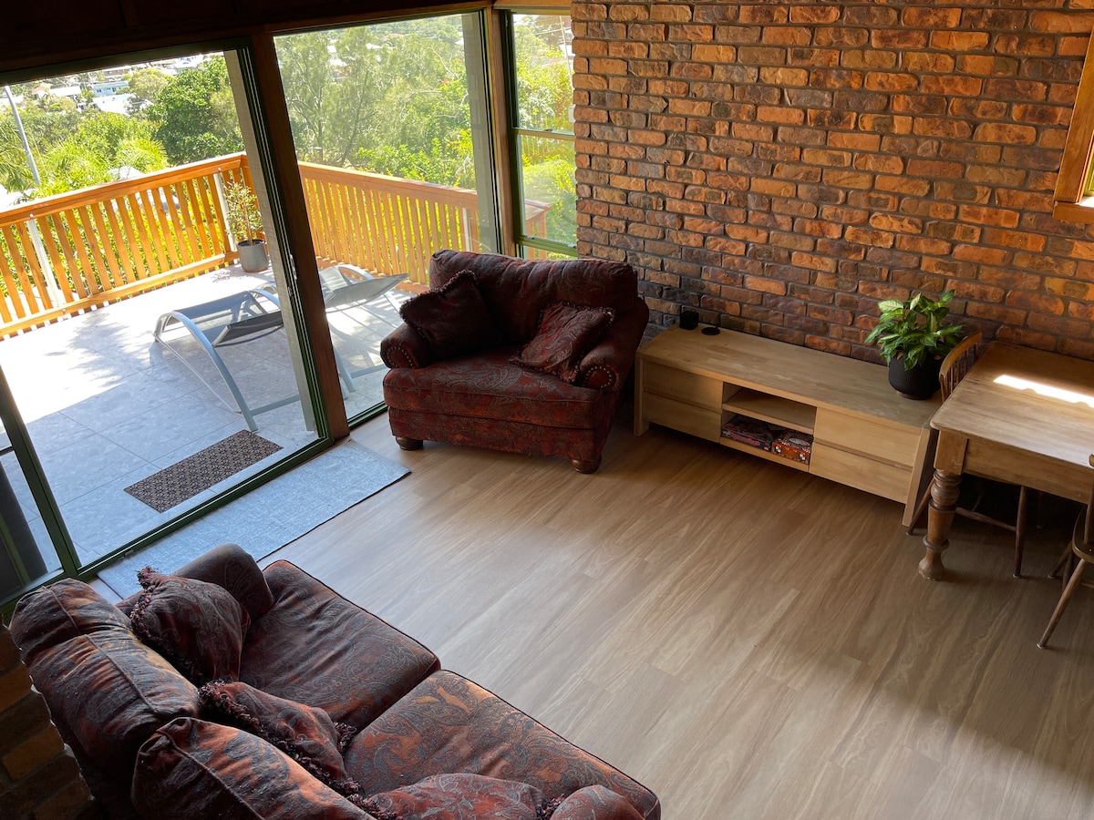 Grass Trees On Skyline offers beach & mountain views. Watch people surfing the point and sunrises over the ocean from the bedroom & deck. Soak up stunning winter sunsets over the mountains from the large [35m2] undercover deck. You have an easy 500m walk to shops/cafes & 800m to beach. The walk home is easy it’s just the last 60m to the apartment which is pretty steep. The apartments North-East aspect is perfect for warming winter sun all day & nice cool afternoon sea breeze in summer.