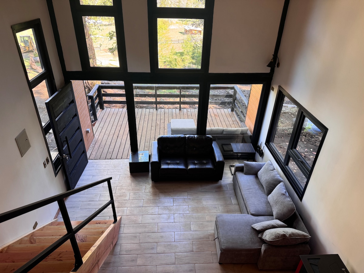 Escape to the forest in a cozy loft with a fireplace, covered terrace, and volcano view. Set by the Liucura River, close to hot springs, lake, and national park. Sleeps 4. Fully equipped kitchen