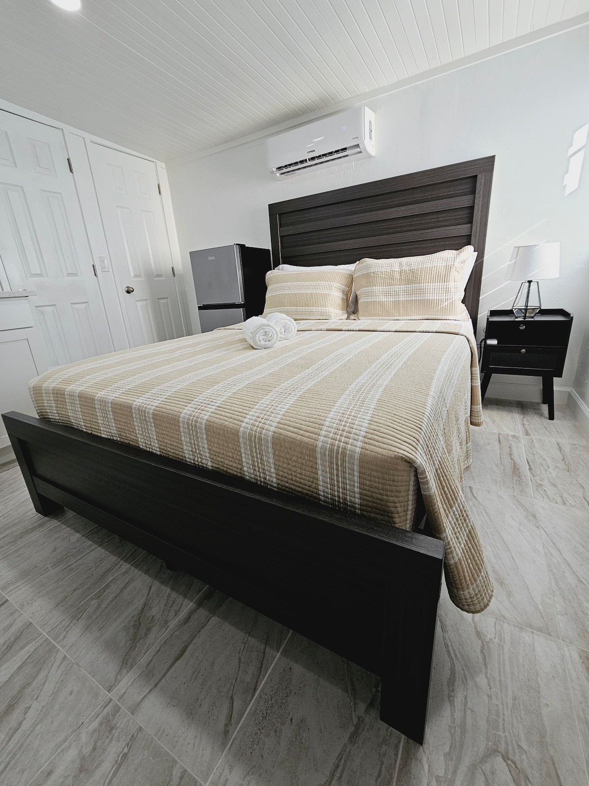 This NON-SMOKERS effenciency apartment has a comfy firm King mattress with a foam topper. Melt your stress away as you sleep PLEASE NOTE: The Apartments laundry is done on a weekly basis… but personal laundry can be done in a local Laundromat. A small kitchen area (NO STOVE) private entrance in a quiet ,safe neighborhood.Close to shopping and hospitals and other Florida The Air is set at 77*