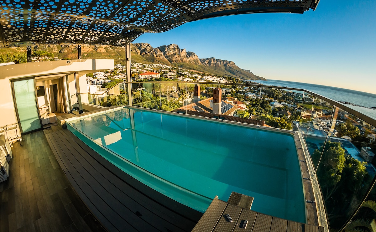 Experience the ultimate Camps Bay retreat at bliss Villa, featuring private pool, hot tub, panoramic ocean views and a short 3 min stroll to the iconic Camps Bay beach. Airy open-plan, spacious, safe & beautifully positioned with a commanding view over Camps Bay. Location and views, a rare find. Ample parking. Back up solar power system. Uncapped Fibre, Netflix, Showmax. First class restaurants, 3 supermarkets, live theatre & nightlife on tap. Cleaner Week-Days 10am to 3pm.