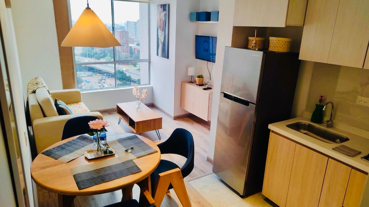 Stunning loft with breathtaking city & mountain views. Indulge in the most luxurious bed in the building, providing a level of comfort akin to a five-star hotel. Plush pillows ensuring the best sleep of your life. Enjoy a 60" TV with Netflix, a well-equipped kitchen, and relax in the easy chair by the window. Hot water shower, Hairdryer, ample closet space, and a perfect work area. Upcoming amenities: rooftop, coworking, gym. Close to Transmilenio station. Book now for an unforgettable stay