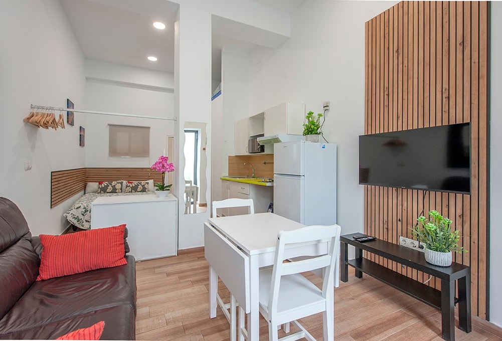 [MYLU SUITES by PUERTA CATHEDRAL] One-bedroom apartment ideal for families with a maximum occupancy of 2 adults + 1 child up to 18 years old. Private bathroom open to the bedroom. Located in our MYLU SUITES by PUERTA CATEDRAL building, a privileged setting in the heart of Seville. A few meters from the Cathedral and the Royal Alcázar, the two most visited monuments in the city. Shared terrace in the building with a swimming pool.