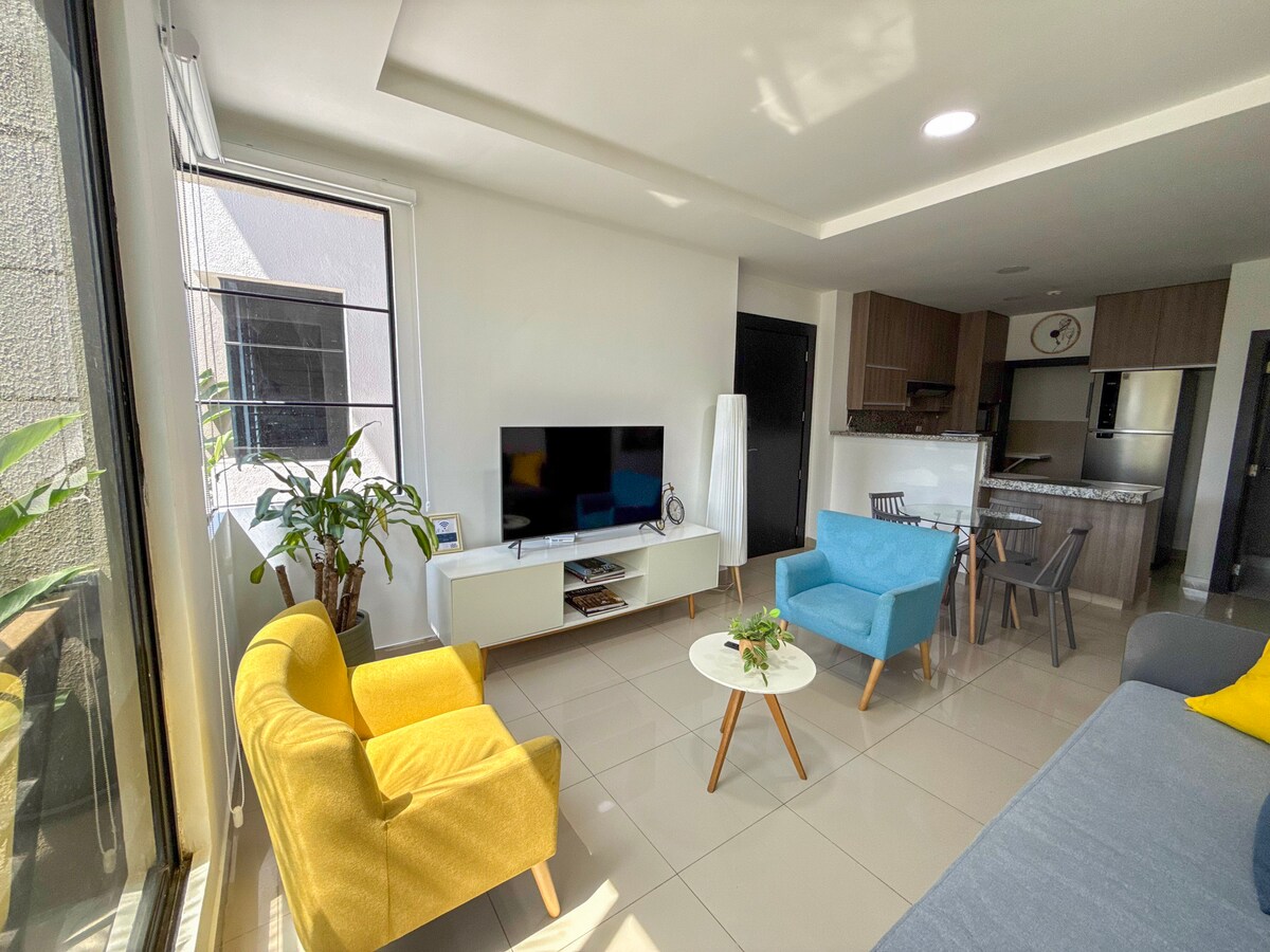 Looking for a comfortable, modern place full of amenities? This suite is for you! King Size Bed Rest like never before in a super comfortable king size bed with high quality bedding. Kitchen kitchen 🚪 Entrance with electronic lock Security and easy access 24 hours a day. Large closets Prime location! - A few steps from supermarkets, squares and the famous Country Club. - Social area of the development. Book now and experience the best stay in Ciudad Celeste!