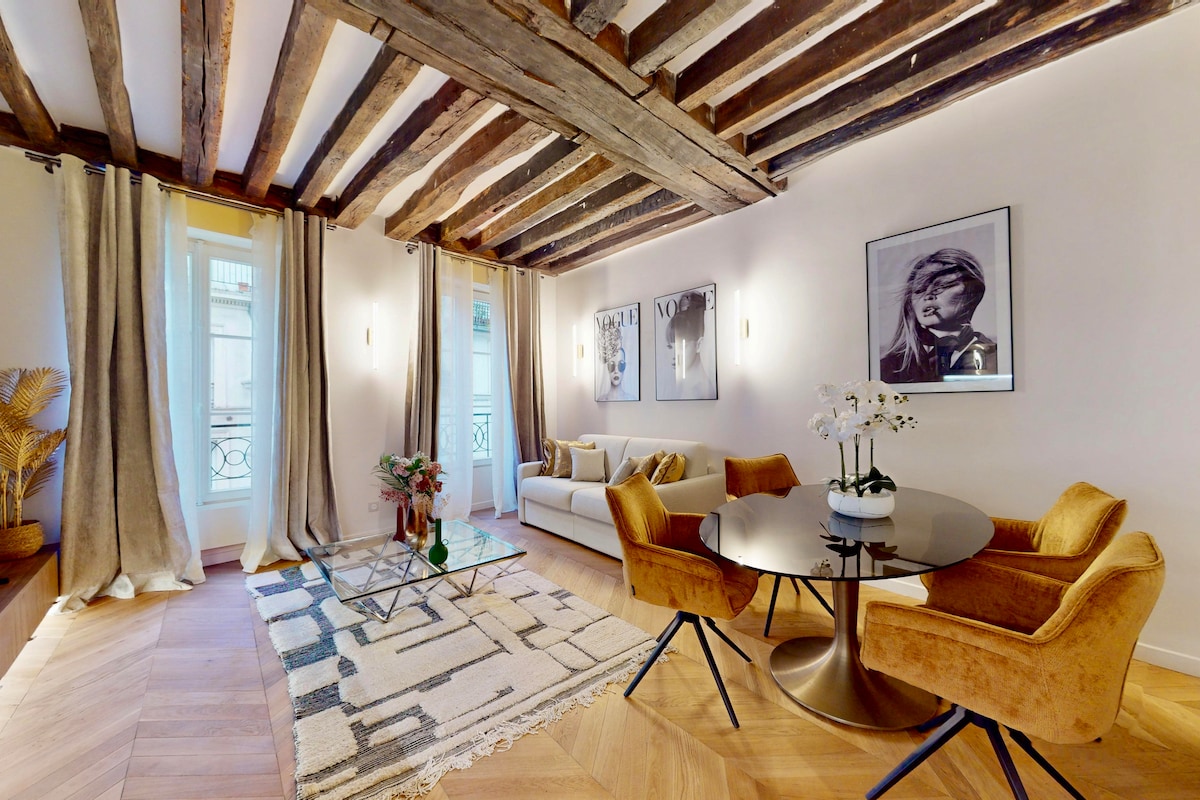 60 m2 air-conditioned apartment with high-end layout in the very center of Paris, historic district of Montorgueil, famous for its food shops, small bistros and restaurants. The apartment is located on the 1st floor of a building on a very quiet street. It was refurbished in 2023 by a famous architect and therefore very well arranged with very high-end amenities. You will be like in a hotel suite with the charm of a real Parisian home.