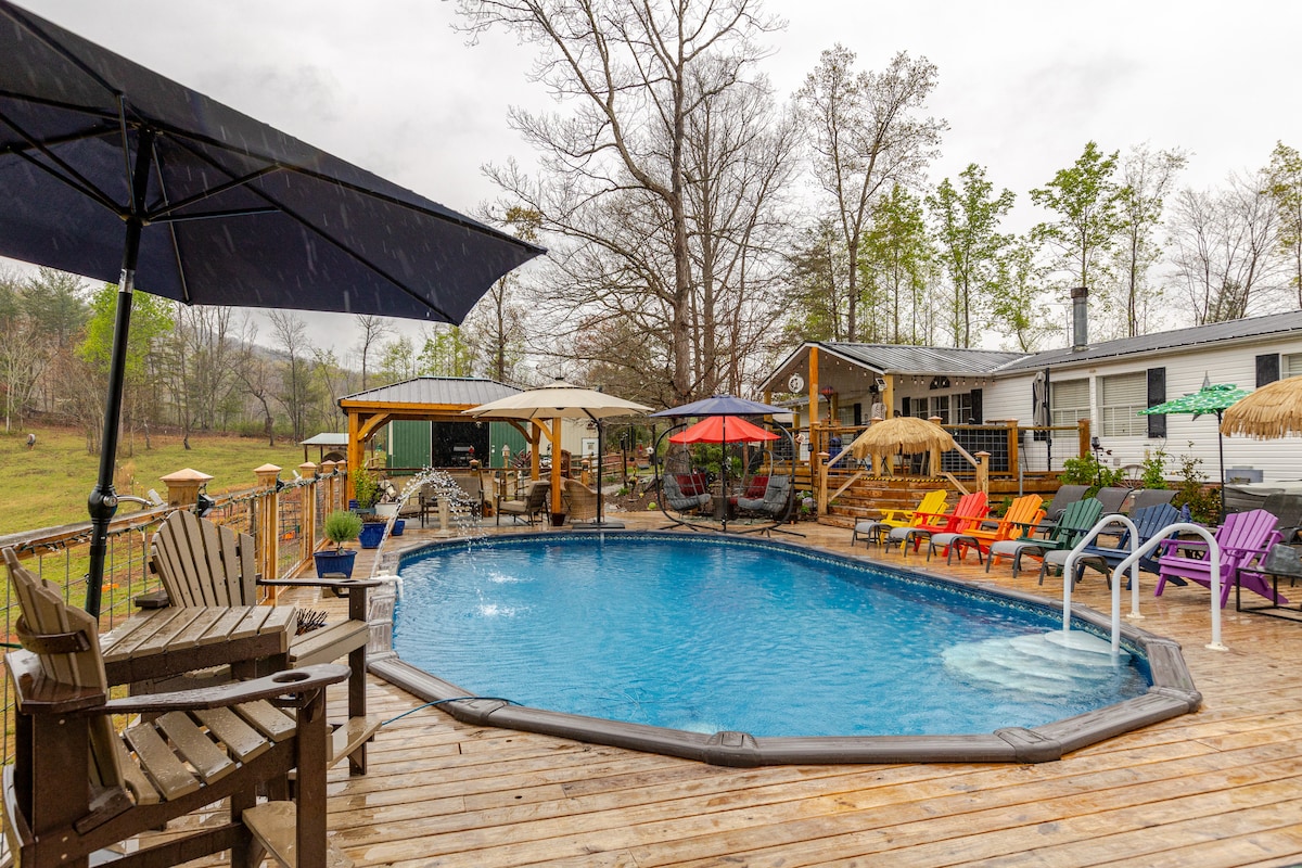 Welcome to our private Guest House/Pool with stunning views and a nature-like experience. Located in the foothills of NC. Nestled high on ridge with fields, gardens and over 100 Japanese Maples. Our views are endless with amazing sunsets and sunrises Relax on our property overlooking lakes/valleys and long range views We will not utilize guest house area during your stay. Foliage around pool adds privacy. Includes Queen, kitchenette, 50” Smart TV, 610 count sheets, snacks and beverage basics