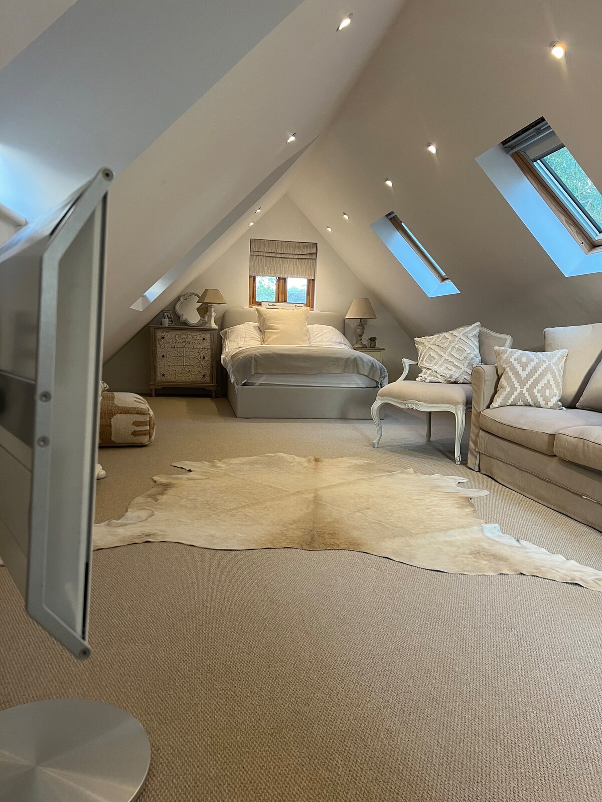 Redwood is a charming loft conversion with views overlooking a garden, swimming pool, and farmland fields in the perfect location for both the South Downs and the Surrey Hills Area of Outstanding Natural Beauty, with several nearby pubs. Situated within the quaint village of Loxwood, you can enjoy the enchanting Surrey/Sussex countryside and rich wildlife. Enjoy a drink as the sun sets over our swimming pool or a picnic looking over the stunning nearby views. Continental Breakfast included.