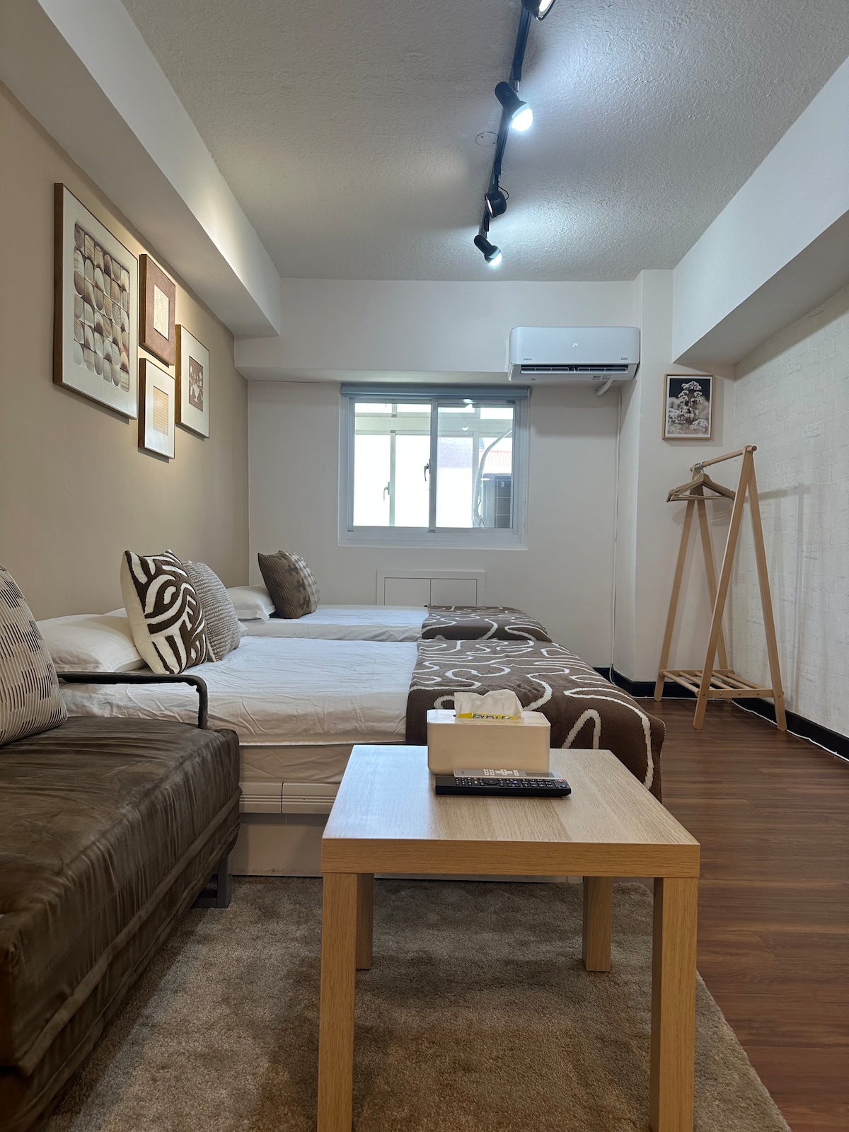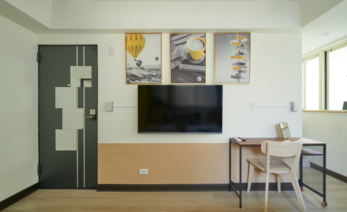 室內的灰白主色,配搭北美木紋銅色傢俱及家飾, 用心為您的居住空間提供沈靜優雅的感覺。日韓系電器的選用,不論是無線充電藍牙喇叭,大螢幕伸縮高清電視,都能滿足您對影音效果的要求。房源位於高樓內縮樓層,阻絕不必要的噪音並滿足您對景觀,安靜及隱私的要求。大樓並配有全天候警衛,住戶專屬電梯,公用大露台,以及地下收費停車場, 位處西門町核心路段,無論搭乘捷運或自駕都非常方便。Earth tone- based interior design offers warming, calm, healing and delighted atmosphere. Room facilities, including double bed, en- suite bathroom with shower enclosure, air conditioning, smart 4K TV with movies/Netflix, WIFI internet, cove lighting and music player with wireless connection & USB charger ports.