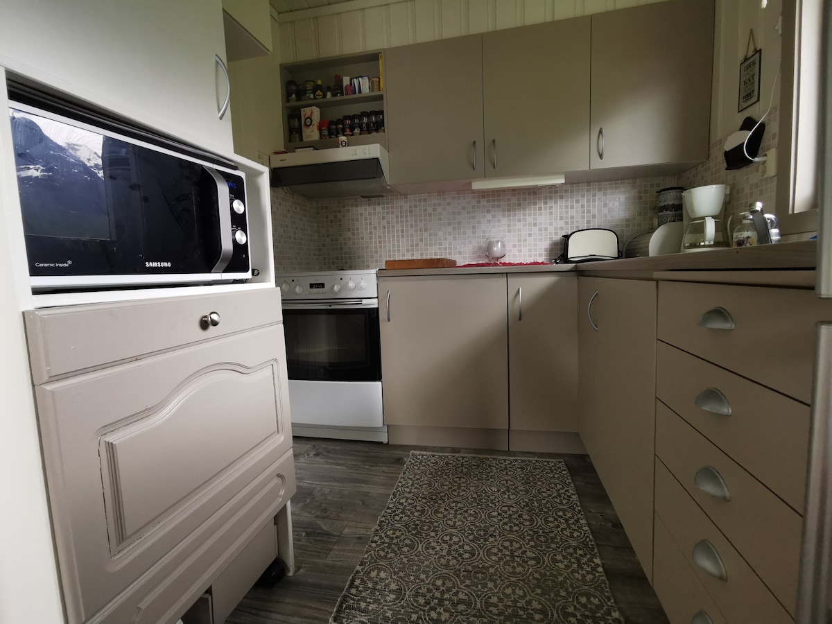 Welcome to our spacious apartment, perfect for relaxation and exploring the beautiful surroundings of Sogndal. The apartment is part of a detached house and offers modern amenities, including a brand-new kitchen and three comfortable bedrooms. There is also a bathroom with a toilet and a separate laundry room. The large living room is ideal for relaxation, with two sofas, a TV, and, most importantly, spectacular views of Barsnesfjorden. Enjoy long summer evenings on the spacious veranda.