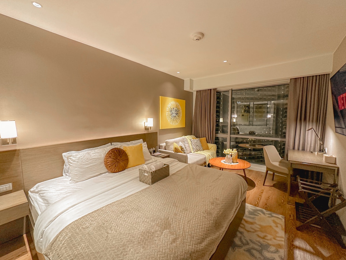 Luxurious 1 Bedroom unit. Walking distance to malls, 24hrs convenience stores, restaurants, groceries, and Lively Nightlife. ♛ 55" 4k UHD TV + A/C + Workspace ♛ Nintendo Switch for more fun! ♛ Netflix, Disney+, and Youtube access ♛ 400mbps upload and download speed! ♛ Board games are provided if you wanna have fun with friends! ♛ fresh towels, and essentials provided ♛ Kitchenwares, cooking appliances, Microwave ♛ Coffee Machines ♛ Steam Iron, Hairdryer and Water Heater