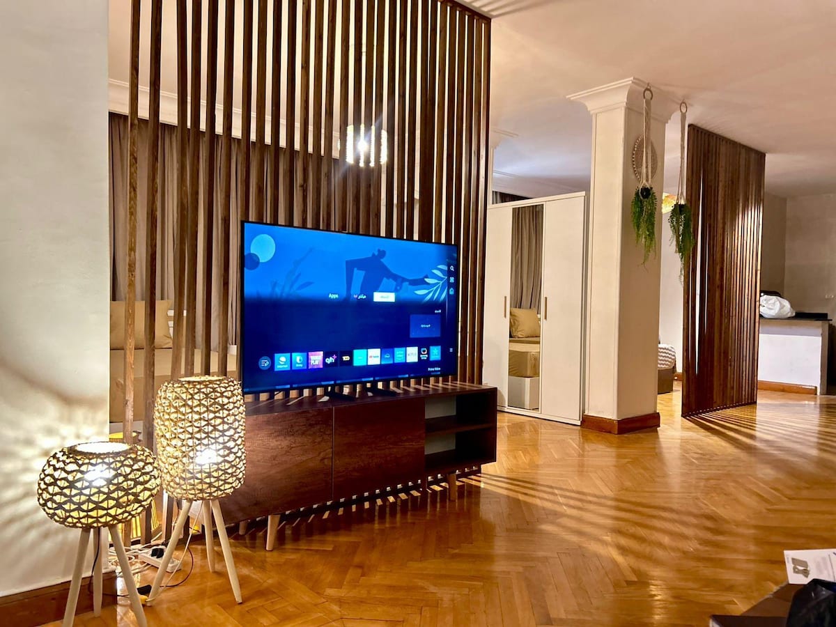 Stylish newly renovated studio in Sarayat Maadi, perfect for solo travelers, couples, or business trips. Features a cozy double bed, smart TV, Wi-Fi, fully equipped kitchenette and bathroom. Enjoy garden views or relax on the private rooftop. Located on Road 11, just a short walk to the metro, Road 9, shops, and cafes. Ratios Bakery is right downstairs for coffee or snacks. Comfort and convenience in a prime Maadi location.