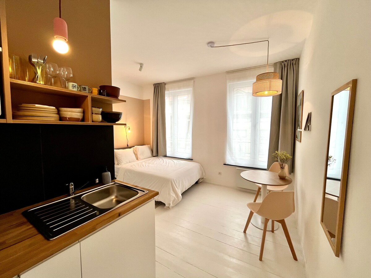 Get comfortable and enjoy this spacious studio. The space is perfect for a couple, which a comfy king bed and en- suite bathroom. Close to Arts Loi metro and Madou station. Near Ambiorix Square, the Royal Park and to European Commission. The studio is at the bottom floor of our renovated 1800s house. The bottom floor used to be an ‘Librairie’ but now converted to a studio. Note that we provide a coffee machine, kettle and mini fridge, but there is no actual kitchen for cooking in the studio.