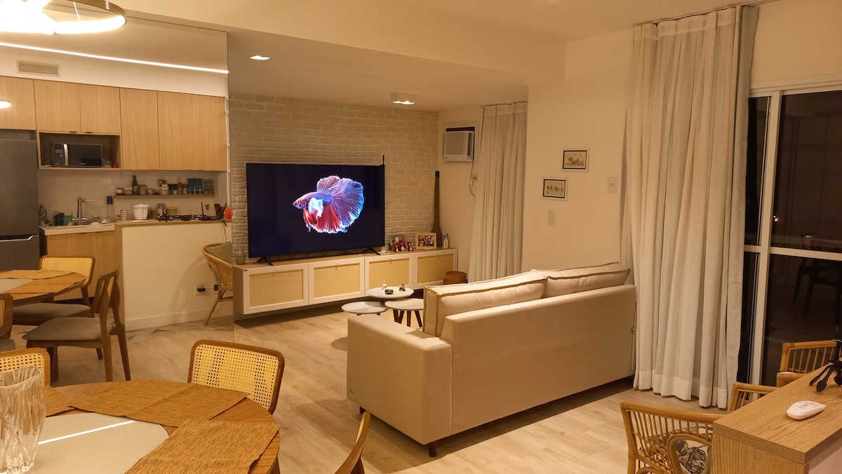 Exquisite apartment in a safe condominium with complete infrastructure. Complete apartment with Wi-Fi. Composed of an en-suite with a double bed, 40" TV and air-conditioning; bedroom/office with a double sofa bed and air-conditioning; living room with two environments, with a 75" Smart TV, dining table and air-conditioning; guest bathroom; full kitchen; and an external balcony with a hammock. Washing machine available. Condominium with children's playroom, playground, game room, fitness center, swimming pool and sauna.