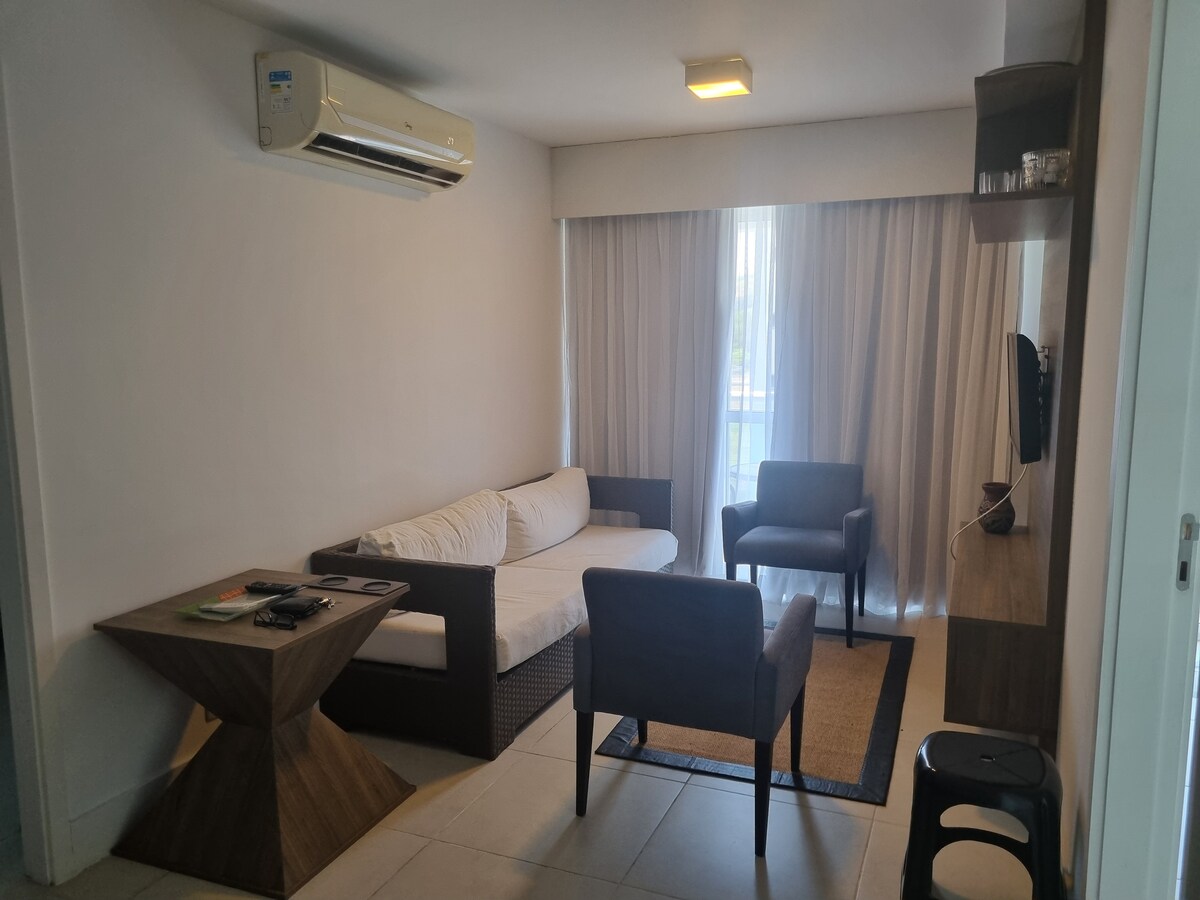 1-bedroom apartment in a residential area on the edge of Pontal Beach in Recreio dos Bandeirantes, with air conditioning in the living room and bedroom. With resort infrastructure, overlooking Estrada do Pontal, accommodation for 4 people, 1 double bed and 1 double sofa bed in the living room, high-speed Wi-Fi. SMART TV in the living room and bedroom. It has direct access to the beach, heated pool, outdoor pool. Restaurant paid separately, serving breakfast, lunch and dinner. The meal is charged per kilo.