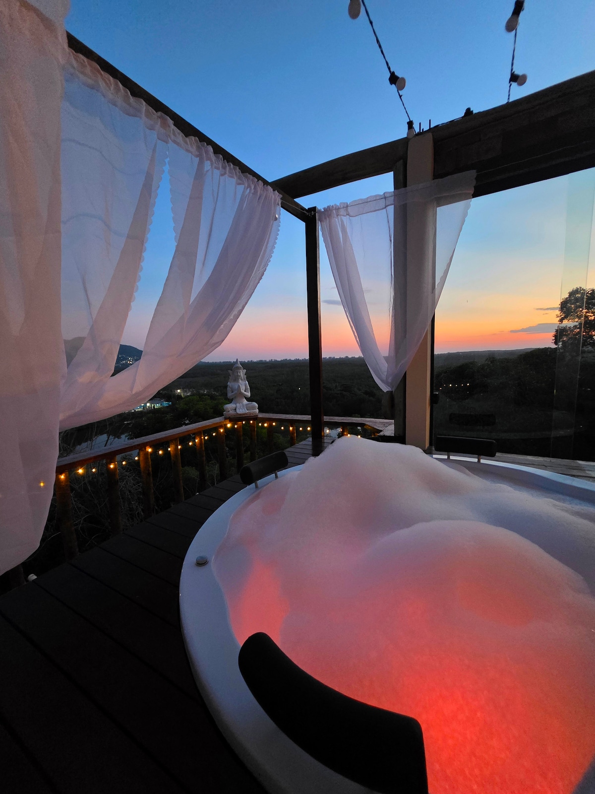 Chalé da Paz is a rustic loft in eucalyptus, new (opened on 02/23/2022), built in the midst of nature. The balcony with Jacuzzi offers a beautiful view of the forest, the sea on the horizon and an unforgettable sunset. Air conditioning, 55" TV and wide view in all rooms. Very well-decorated suite with a king-size bed, bed linens and brand-new white towels. The kitchen is fully equipped. It has a stove, refrigerator, microwave, all cutlery, pots and dishes.