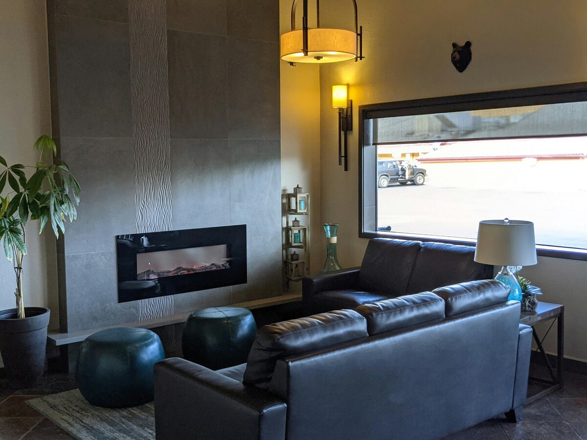 This room at Little Valley Inn features warm colors and original Indian metal artwork. Inside, 1 queen bed, fridge, microwave & barrel chair add to your comfort. Situated in a back corner, the outside patio boasts views of giant granite rocks, the ancient Indian grinding rock and our backyard forest area. Upgraded with advanced heating and cooling system all new for 2021. Offering a free breakfast and NO CLEANING FEES.