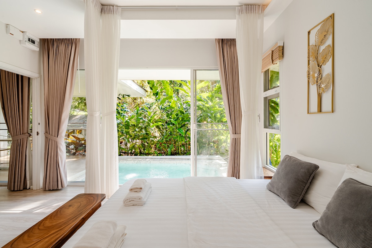 A well-lit sleeping area features two spacious beds adorned with white linens. Artwork depicting tropical scenes is displayed on the wall above the beds. Large glass doors provide an unobstructed view of the outdoor pool area, with curtains offering adjustable light control.