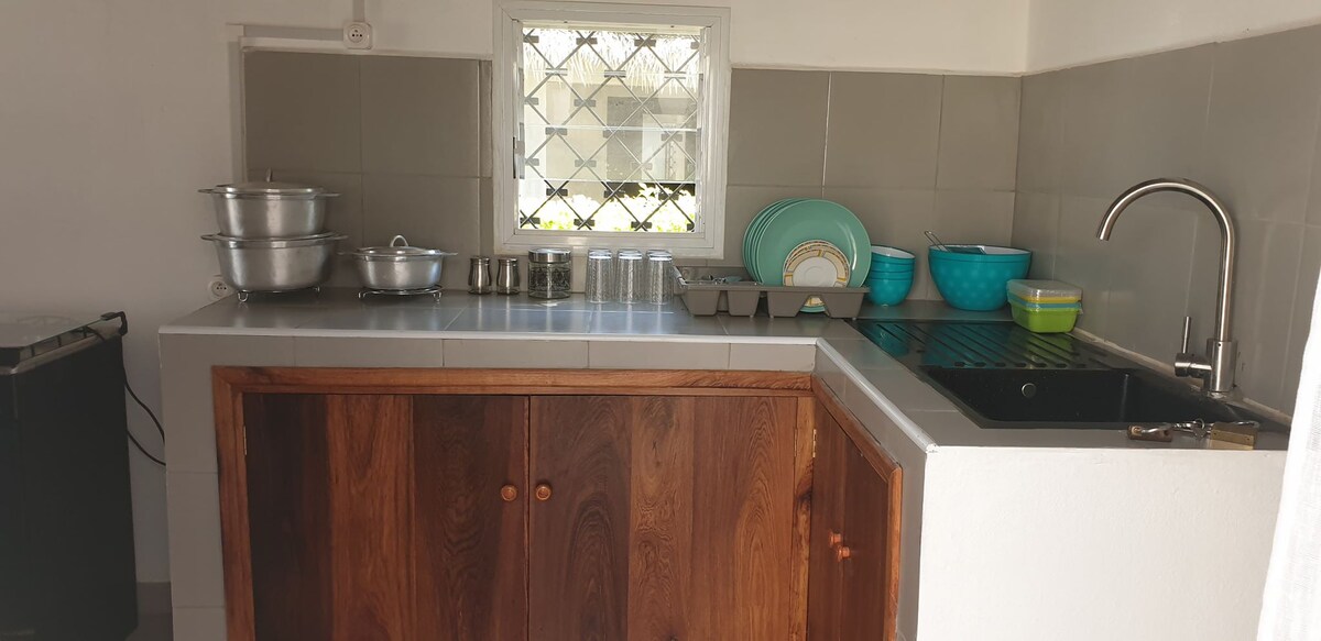 Bungalow rental located in Amborovy center, MAJUNGA. In a quiet and peaceful wooded property, close to all amenities, 4 minutes from the airport, 6 minutes from the beach and 10 minutes from the city center. The bungalows are fully equipped with a large 3-seater bed, possibility to add an extra mattress TV, kitchen equipped with gas stove, fridge, oven and cooking utensils, linen. A guard is on site. All furnished with rosewood furniture.