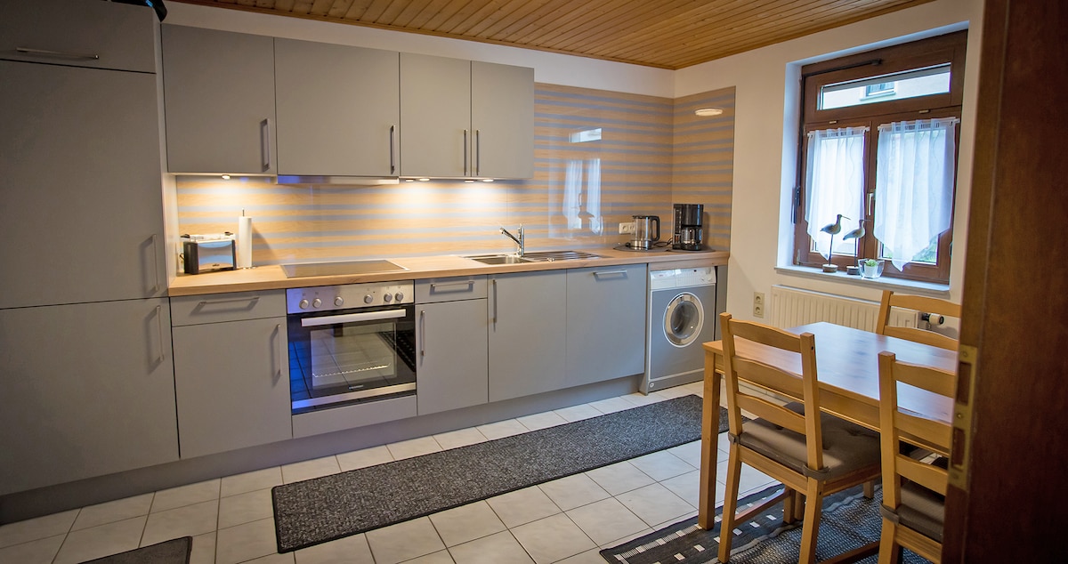 Small studio in the middle of nature with about 35 m2. In the studio you will find everything you need; a large comfortable double bed, a fully equipped kitchen with dishwasher, fridge, etc., a bathroom with a bathtub and shower cabin, a dining table and a small seating area. A great distant view from the windows in the bedroom. A covered outdoor seat in the garden can also be used. 1.5 km away is Schöllkrippen with all the shopping opportunities.