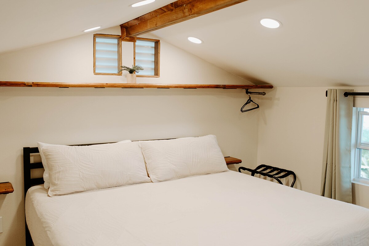 7 minutes from the airport, 9 miles from downtown Kona, and a short drive to nearby beaches, this delightfully chill guest loft is perfectly situated for exploring all the island has to offer! The bright, tasteful decor is a nod to a musical paradise of yesteryear with both mid-century flare and rustic beach shack charm. It has a kitchen, queen bed, 55” smart tv, private lanai with a panoramic view of the Kona coast and a shared bbq. The Loft sits above the carport on the 2nd floor.