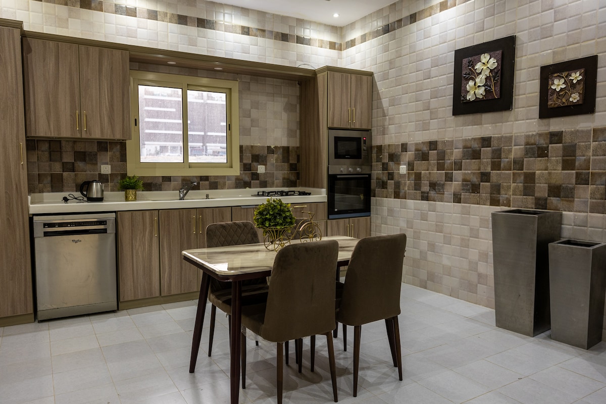 A luxurious hotel✔️ apartment characterized by quality, sophistication and luxury in its finest details of furniture and central air conditioning. The apartment✔️ contains: - 4 comfortable bedrooms (3 double / 1 single) - 3 spacious bathrooms and an indoor and outdoor laundry. - A spacious hall with a comfortable Ashley sofa and also rocking chairs that can be stretched out to relax on. - A large separate kitchen with a dining table, a large refrigerator, an oven, a microwave, and a stove for cooking It has a separate laundry room with an automatic washing machine and an ironing table. ✔️ It is ideal for families and pilgrims in terms of space and comfort.