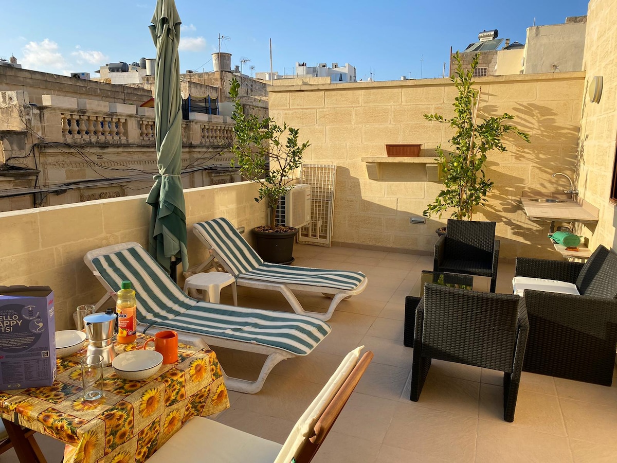 Studio with a large terrace centrally situated in a quite side street. A stone throw's away from the bus terminus with buses to Valletta, Mdina, the sandy beaches in the north of the Island and Cirkewwa where one can take the ferry to cross over to Gozo our sister Island. Only 50 metres away you can find a great variety of shops, pharmacies, supermarkets, restaurants, coffee shops, jewellery shops and a laundrette. You can also find Pleasure Curise boats and open top siteseeing buses.