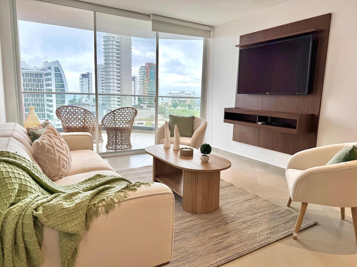 Este departamento es ideal para una escapada en pareja! A pasos de la Quadra, centro comercial con restaurantes y variedades. Zona segura de Manta con amenidades como piscina jacuzzi y juegos de billar y Ping pong en área social. Tranquilo, elegante y cómodo!