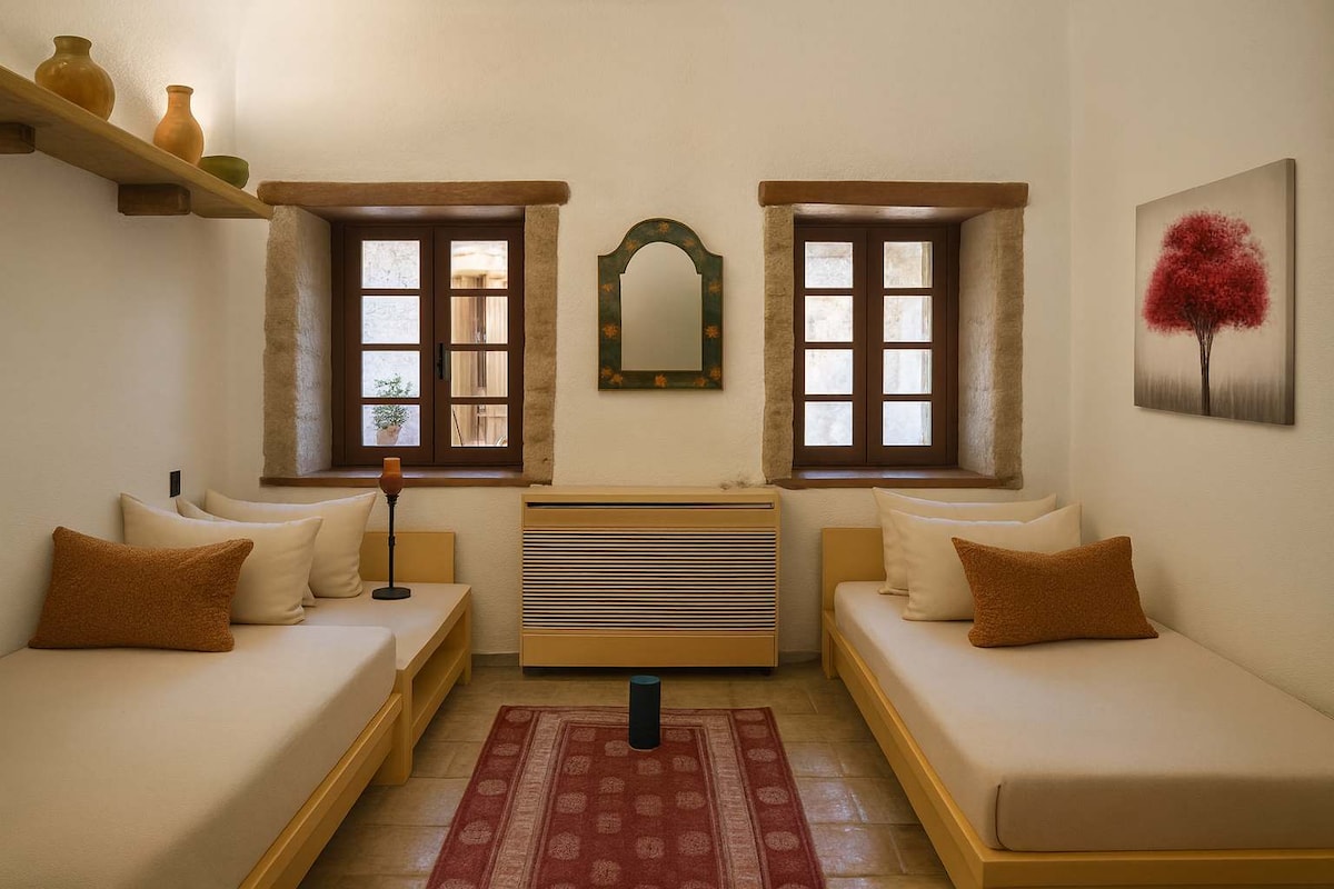 Boasting a lovely garden view, within the walls of the fortress on the worldwide known Monemvasia Rock, this suite awaits you for unique moments! Gaze upon the magical, romantic sunsets, stroll along the picturesque stone-paved alleys, taste the Greek cuisine specialties and create unique memories you will cherish forever. Nearby you can find sandy beaches like Monemvasia (2km), Pori (6km) and Abelakia (7km). Free Wifi available to our guests.