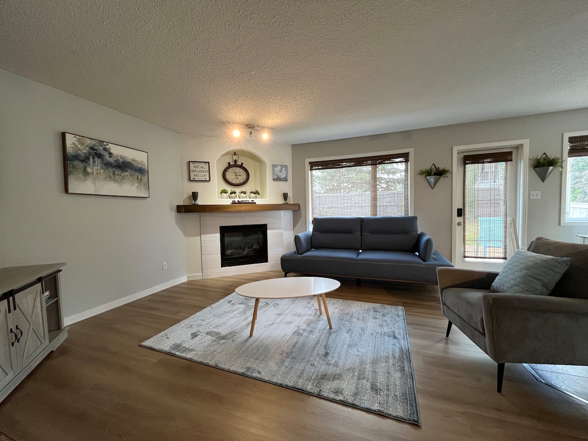 Relax and unwind in this spacious and stylish cozy suite with a view. The space is a walk-out basement suite with free parking and private entrance, patio, fenced-in yard, and hot-tub. Take in the park views while enjoying a sip or two on the private patio. The suite is located in the heart of St.Albert and within walking distance to amenities, parks, trails, shopping, recreation, and a short 20-minute drive to West Edmonton mall. Small dogs can be accommodated.