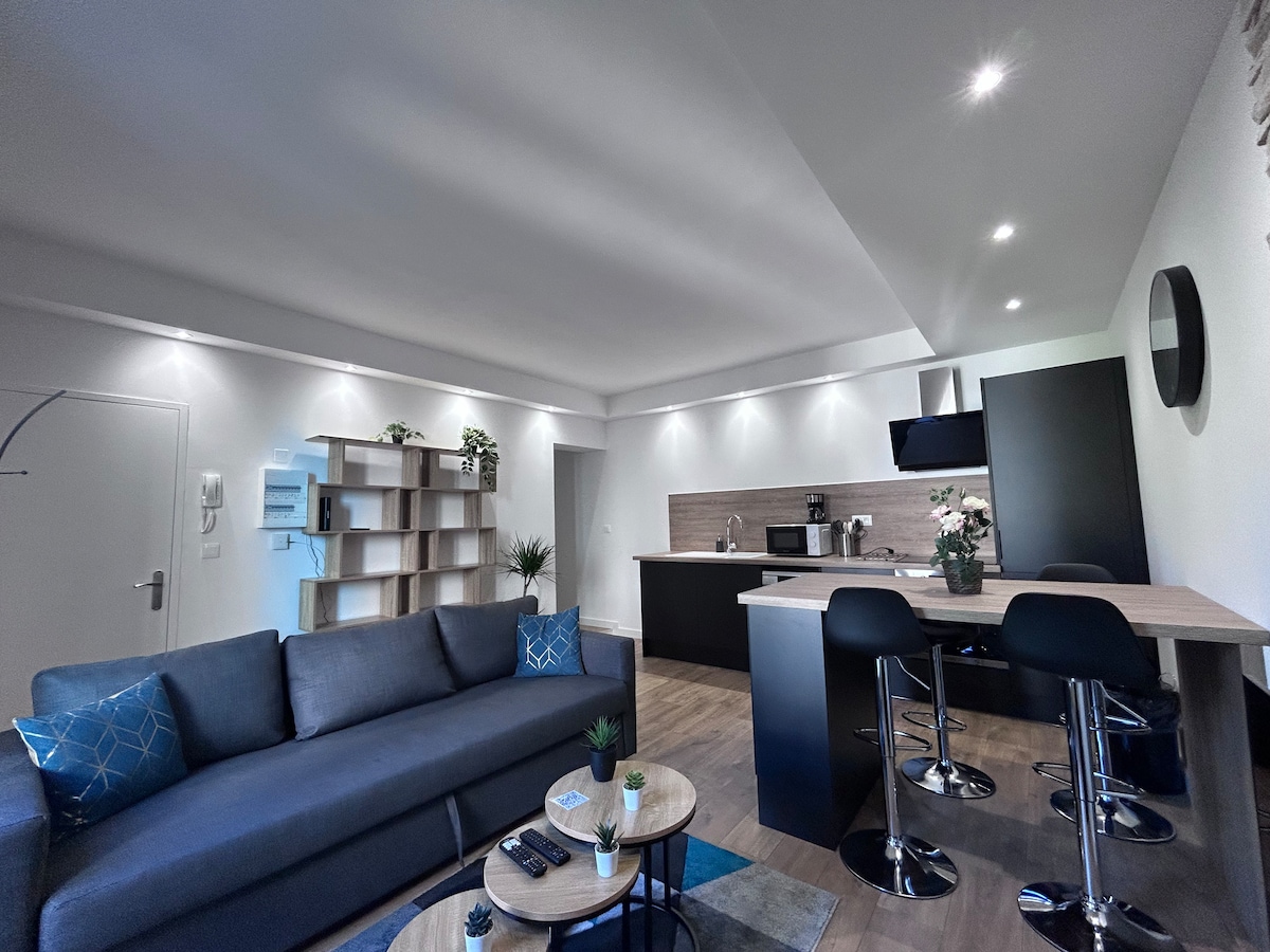 ground floor accommodation, immediate parking, Large living room with sofa bed for one person and 1-seat armchair. New kitchenette, Wi-Fi office space and beautiful bathroom (shower). Cozy atmosphere. Close to all amenities, bus station and SNCF. Immediate bus stop, close to the Town Hall and Tourist Office, suitable for single person. Quiet neighborhood. No smoking.