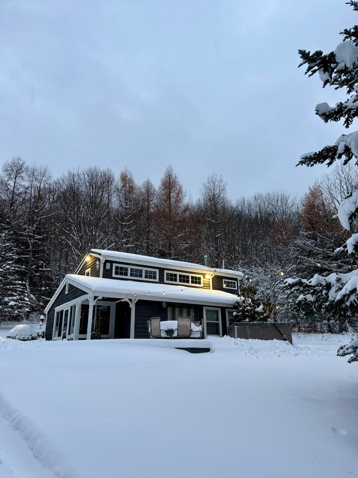 Welcome to our luxe Après Chalet! Beautifully renovated with design & comfort in mind, we're thrilled to welcome you to our gorgeous chalet featuring amazing views, luxe interior design and crowd-pleasing amenities (outdoor hot-tub, barrel sauna, fire-pit & more). This beautiful & private lot is surrounded by mature pine trees with amazing views of EVL skiing. Easy access to the center Ellicottville (4 min) and skiing, hiking/mountain biking trails, tubing, golfing & more (4-8 min)