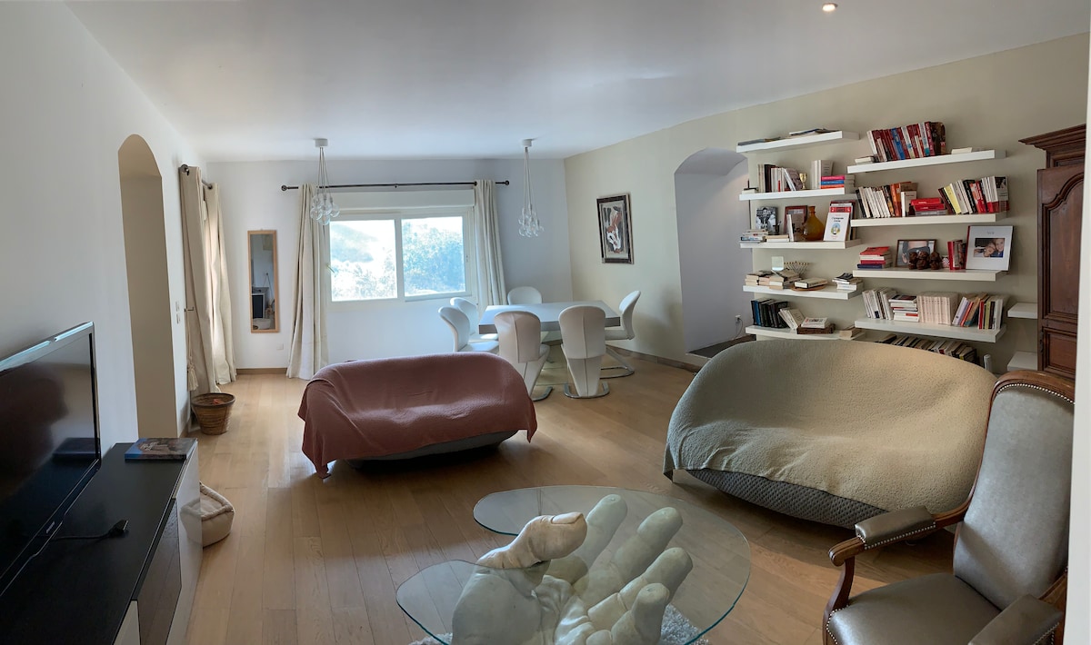 Our accommodation offers magnificent mountain views. You will share a 6 X 3 M pool with us. Walking distance to the beach. Completely renovated by us, with unique and refined decor. You have 2 single beds in the bedroom and a 140 X 190 sofa bed in the living room. The terrace is equipped with armchairs, table, chairs, barbecue. Isolated in a huge garden you will be in absolute calm. Your children and pets will be able to move around safely