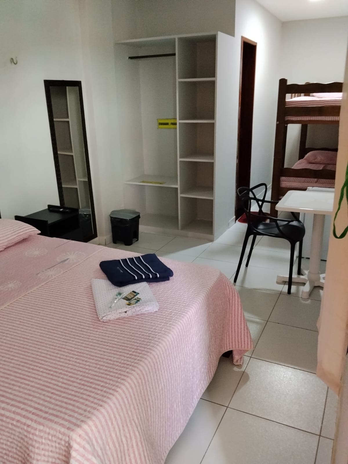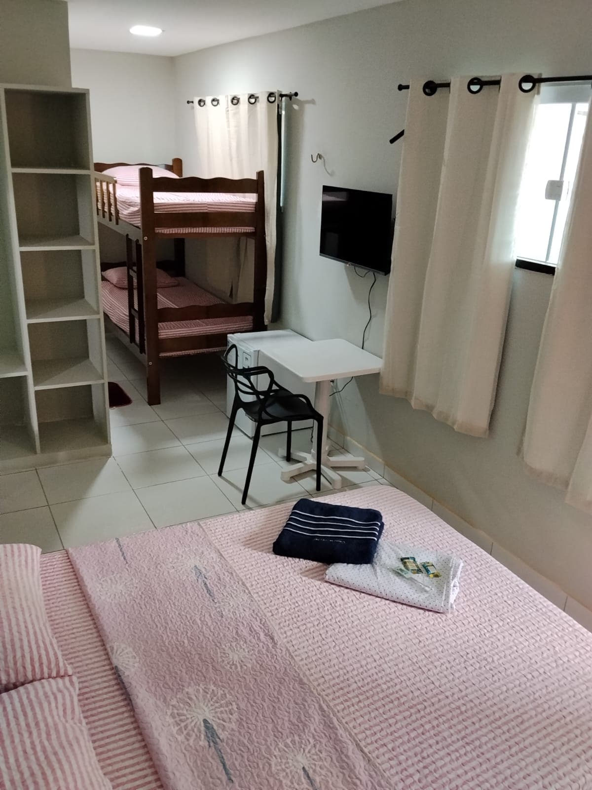 Quarto 303: Conforto e privacidade com cama de casal, Beliche,banheiro. Ideal para casais ou pequenas famílias. O quarto possui ar condicionado, closet, mesa de trabalho e ambiente aconchegante para garantir uma estadia confortável. Venha desfrutar de um ambiente acolhedor e moderno para sua estadia.
