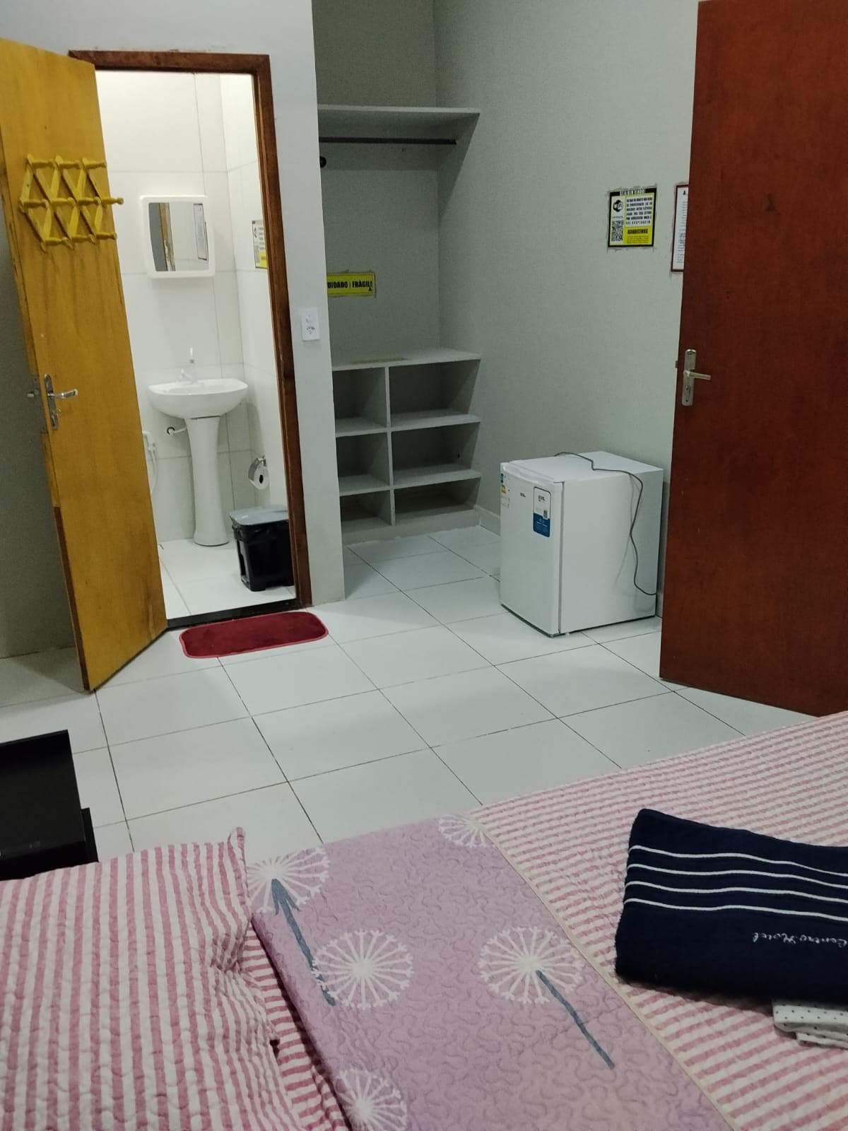 Quarto 101: Conforto e privacidade com cama de casal, cama de solteiro, local para rede, alem de um lindo jardim e banheiro privativo. Ideal para casais ou pequenas famílias. O quarto possui closet, mesa de trabalho e ambiente aconchegante para garantir uma estadia confortável. Venha desfrutar de um ambiente acolhedor e moderno para sua estadia.